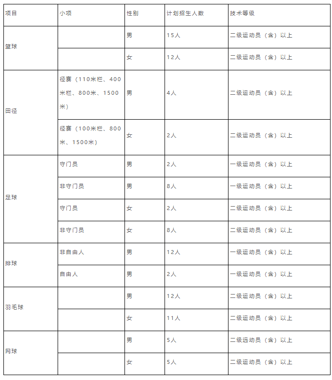 1.招生项目:篮球(男子、女子)、田径(男子、女子)、足球(十一人制)(男子、女子)、男子排球、羽毛球(男子、女子)、网球(男子、女子)